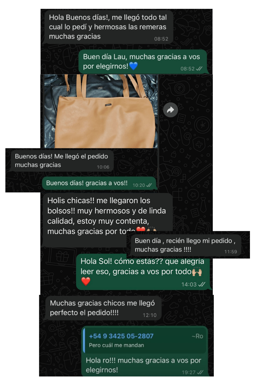 “Me llegaron los bolsos, hermosos y de linda calidad. Estoy muy contenta, muchas gracias por todo.”